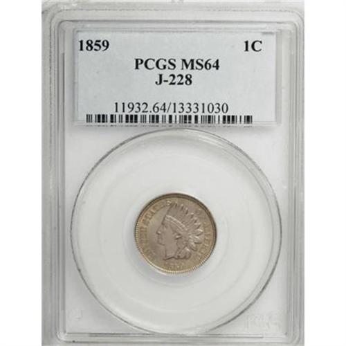 <B>1859 P1C Indian Cent, Judd-228, Pollock-272, R.1, MS64 PCGS.</B></I> While one of the more frequently encountered patterns, and also one of the few made as a business strike, the Judd-228 is a popular item for collectors of Indian cents with its Obverse of 1859 and Reverse of 1860. The light copper-nickel alloy is abundantly evident on this pale coin. That being said, there is an accent of reddish patina around the margins that adds character and visual interest. A lovely example.<BR><BR><b>Shipping:</b> Coins & Currency (<a target="_blank" href="http://www.heritageauctions.com/common/shipping.php">view shipping information</a>)