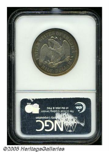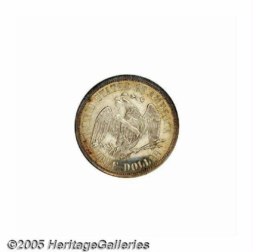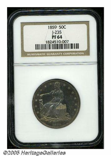 <B>1859<P50C> Half Dollar, Judd-235, Pollock-282, 284, R.5, PR64 NGC.</B></I> Anthony Paquet's design for the Seated Liberty series, here in the Half Dollar format. Liberty is seen seated in a stiff pose, left hand resting on an upright shield, right hand atop a fasces. The reverse features an eagle with outstretched wings, a scroll inscribed E PLURIBUS UNUM in its beak, and the usual statutory legends above and below. Struck in silver with a reeded edge. This is the broken ribbon variety with the end of the ribbon on the reverse floating in the field. A lovely Proof example with pale champagne toning.
