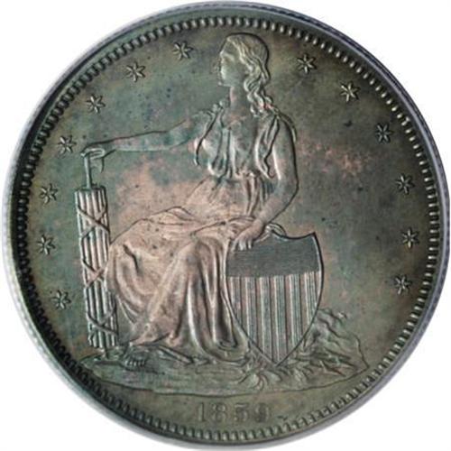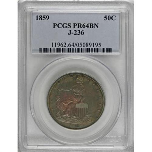 <B>1859 P50C Half Dollar, Judd-236, Pollock-283, 285, R.5, PR64 Brown PCGS.</B></I> Anthony Paquet's design offers a seated Liberty facing leftward, looking expectantly toward the horizon. She supports a fasces with her right hand, and balances a shield in her left. The date is in exergue beneath, and 13 stars encircle the ensemble. An eagle and shield with olive and arrows in the claws, appear on the reverse. In its beak, the eagle holds a ribbon inscribed E PLURIBUS UNUM, with UNITED STATES OF AMERICA around and HALF DOLLAR below. Struck in copper with a reeded edge. The strike is from the "Perfect Ribbon" reverse, showing a full ribbon, pointed wingtips, and four vertical shield lines. Both sides are medium olive-brown and greenish-brown, with a small area of coppery brightness on Liberty's lower body. A sharp and pleasing piece.<BR><BR><b>Shipping:</b> Coins & Currency (<a target="_blank" href="http://www.heritageauctions.com/common/shipping.php">view shipping information</a>)