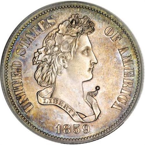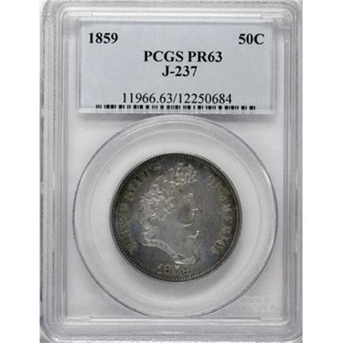 <B>1859 P50C Half Dollar, Judd-237, Pollock-293, R.4, PR63 PCGS.</B></I> Liberty faces right with laurel and vine in her hair. A ribbon below the bust is inscribed LIBERTY, with UNITED STATES OF AMERICA around, and the date below. The reverse has an agricultural wreath around the denomination HALF DOLLAR. Struck in silver with a reeded edge. An exactingly struck specimen with attractive peripheral powder-blue and caramel-gold toning. Faint contact on the cheek and beneath the ribbon is unimportant for the grade.<BR><BR><b>Shipping:</b> Coins & Currency (<a target="_blank" href="http://www.heritageauctions.com/common/shipping.php">view shipping information</a>)