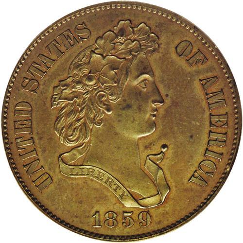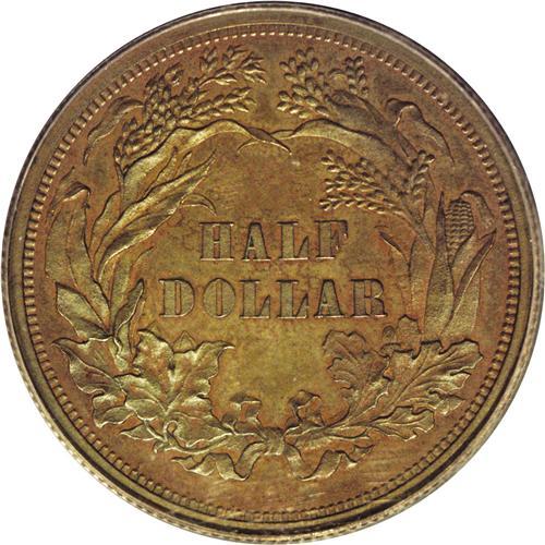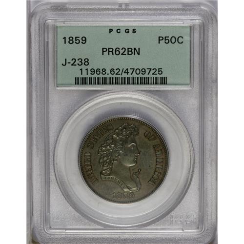 <B>1859<P50C> Half Dollar, Judd-238, Pollock-294, R.5, PR62 Brown PCGS.</B></I> The Longacre (or is it Paquet) design for the half dollar that features the so-called "French head," that is, a bust of Liberty facing right, draped with a ribbon inscribed LIBERTY with a wide wreath of oak and vine on her head. The reverse has HALF DOLLAR in the center and is surrounded by a wreath of cotton, tobacco, sugar cane, corn, wheat, and oak. Struck in copper with a reeded edge. The olive patina shows slight mottling over Liberty's face, and there is slightly deeper color surrounding the peripheral devices, especially on the obverse. Encapsulated in a green label holder.