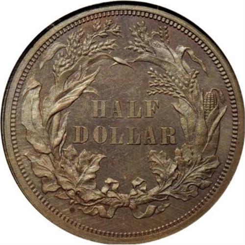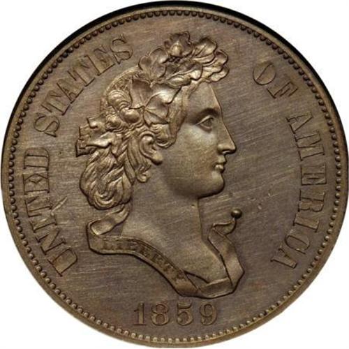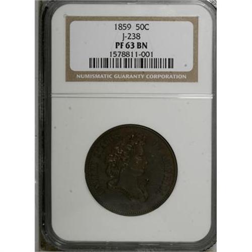 <B>1859 P50C Half Dollar, Judd-238, Pollock-294, R.5, PR63 Brown NGC.</B></I> The so-called "French Head" of Liberty, which faces right, draped with a ribbon inscribed LIBERTY and a wide wreath of oak and vine on her head. The reverse has HALF DOLLAR in the center, surrounded by a wreath of cotton, tobacco, sugar cane, corn, wheat, and oak. Struck in copper with a reeded edge. Chocolate-brown in color with reflective fields that display some faint lines on each side. The obverse has a few minor handling marks. Census: 4 in 63 Brown, 4 finer (9/07).<BR><BR><b>Shipping:</b> Coins & Currency (<a target="_blank" href="http://www.heritageauctions.com/common/shipping.php">view shipping information</a>)