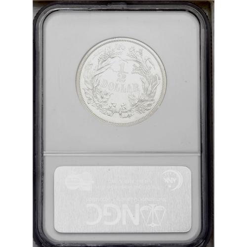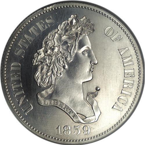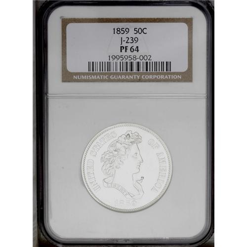 <B>1859<P50C> Half Dollar, Judd-239, Pollock-295, R.4, PR64 NGC.</B></I> One of several half dollar patterns from this year that feature the 'French Head of Liberty,' credited to Longacre. The reverse depicts the denomination as 1/2 DOLLAR, instead of HALF DOLLAR (Judd-237 and Judd-245), 50 CENTS (Judd-241), or HALF DOL. (Judd-243). Struck in silver with a reeded edge. An untoned, well struck, and smooth specimen identified by a tiny obverse rim ding at 11 o'clock.