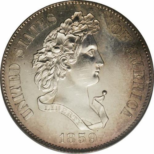 <B>1859<P50C> Half Dollar, Judd-239, Pollock-295, R.4, PR62 PCGS.</B></I> The familiar "French Head of Liberty" 1859 pattern obverse was paired with five different half dollar reverse designs. The reverse for Judd-239 and its Judd-240 copper variant is unique among the reverses, in that the denomination is expressed with a fraction. Struck in silver with a reeded edge. This boldly struck piece has pleasing golden-brown peripheral toning. Light field hairlines are not a distraction for the designated grade. Population: 15 in 62, 23 finer (4/06).