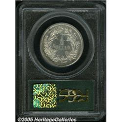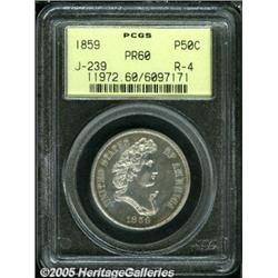 <B>1859 P50C Half Dollar, Judd-239, Pollock-295, R.4, PR60 PCGS.</B></I> Longacre's "French Head" design for the half dollar that features a bust of Liberty facing right, draped with a ribbon inscribed LIBERTY with a wide wreath of oak and vine on her head. The reverse has 1/2 DOLLAR in the center and is surrounded by a wreath of cotton, tobacco, corn, sugar cane, wheat, and oak. Struck in silver with a reeded edge. This is a mostly brilliant example that shows a few light grease stains (as struck) on the lower reverse. Obviously hairlined, this feature accounts for the lower proof grade.