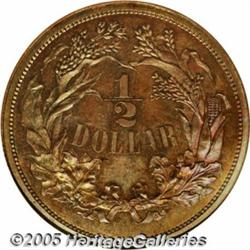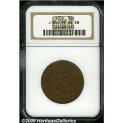 <B>1859 P50C Half Dollar, Judd-240, Pollock-296, R.5, PR64 Brown NGC.</B></I> The Longacre design with the "cereal wreath" reverse. Pattern expert, Saul Teichman, questions whether this pattern was designed by Longacre or Paquet as the 1859 half dollar patterns used Paquet's punches in the legend UNITED STATES OF AMERICA. One of the more available patterns in copper. This piece is struck in copper with a reeded edge. The bright, glassy mirrored fields brighten and enliven the rich chocolate brown, lime-green, and red colorations that cover each side of this attractive near-Gem example.
