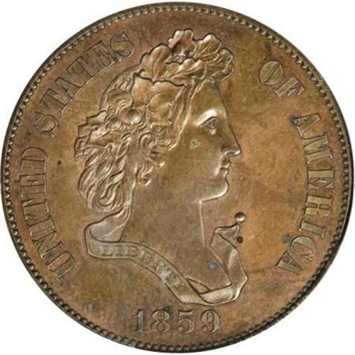 <B>1859 P50C Half Dollar, Judd-240, Pollock-296, R.5, PR64 Brown PCGS.</B></I> The so-called "French Head of Liberty" design, paired with a larger scale version of the dime "cereal wreath" reverse. Tall letters in UNITED STATES OF AMERICA are consistent with Paquet's style, although the portrait is attributed to Longacre. Struck in copper with a reeded edge. Chocolate-brown with glimpses of apple-green across the lower reverse. A few inconspicuous obverse spots barely merit mention. Encased in an old green label holder. Population: 6 in 64 Brown, 1 finer (12/07).<BR><BR><b>Shipping:</b> Coins & Currency (<a target="_blank" href="http://www.heritageauctions.com/common/shipping.php">view shipping information</a>)