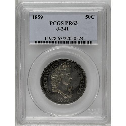 <B>1859<P50C> Half Dollar, Judd-241, Pollock-297, R.4, PR63 PCGS.</B></I> The "French Head" Liberty design for the half dollar, paired with a reverse that has 50 CENTS surrounded by a cereal wreath. Struck in silver with a reeded edge. An exquisitely struck specimen with reflective fields and consistent medium steel-gray patina. Free from unpleasant contact on either side, only a few hairlines serve to limit the grade.