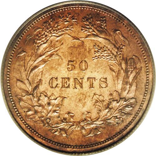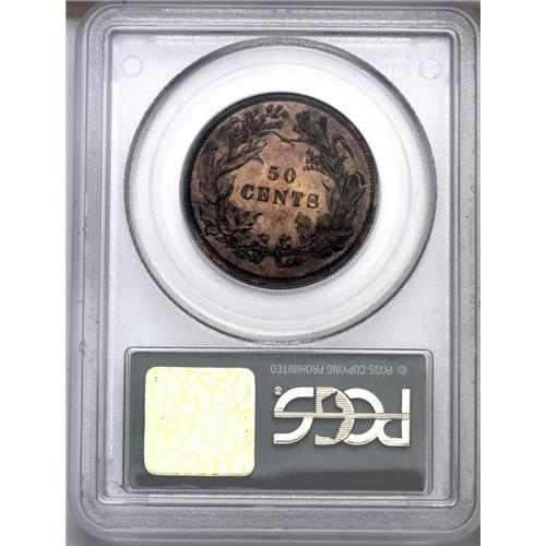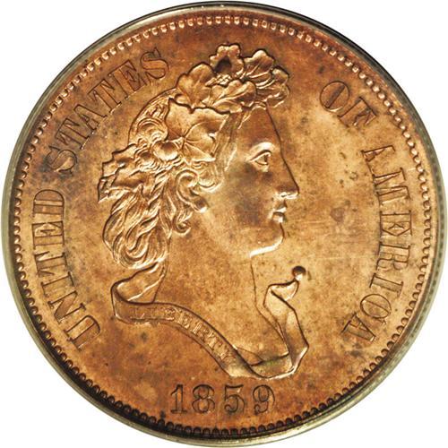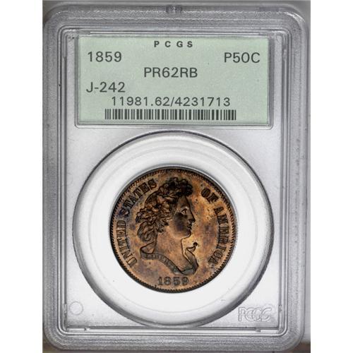 <B>1859<P50C> Half Dollar, Judd-242, Pollock-298, R.5, PR62 Red and Brown PCGS.</B></I> The familiar "French Head of Liberty" design, credited to Paquet because of his preference toward narrow letters in the legends. The reverse has 50 CENTS in the center, and is surrounded by a large wreath similar to that later introduced on the 1860 dime. Struck in copper with a reeded edge. Pink-red in color, the luster is overlaid with a few isolated swirls of medium brown patina. Modest, yet pleasing reflectivity is noted in the fields. Conservatively assessed, and housed in a green label holder.