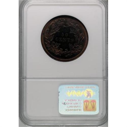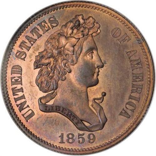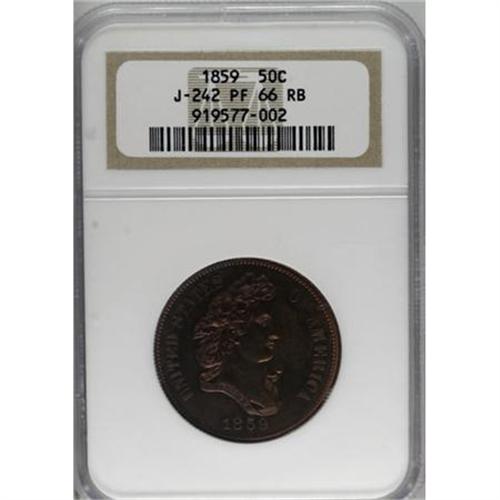 <B>1859 P50C Half Dollar, Judd-242, Pollock-298, R.5, PR66 Red and Brown NGC.</B></I> The familiar "French Head of Liberty" design, credited to Anthony Paquet because of his preference toward narrow letters in the legends. The reverse has 50 CENTS in the center, and is surrounded by a large wreath similar to that later introduced on the 1860 dime. Struck in copper with a reeded edge. Struck from a heavily striated planchet. Each side shows significant mint red, the obverse 60-70% and the reverse 50%. A few small specks of carbon are seen on each side. <BR><BR><b>Shipping:</b> Coins & Currency (<a target="_blank" href="http://www.heritageauctions.com/common/shipping.php">view shipping information</a>)