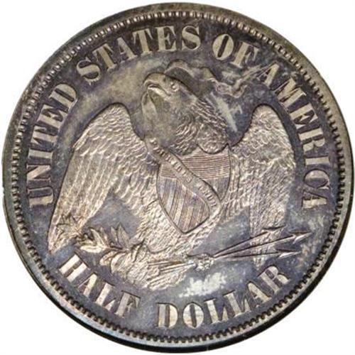 <B>1859 P50C Half Dollar, Judd-245, Pollock-301, 303, Low R.6, PR64 NGC.</B></I> The obverse features the "French Head" of Liberty facing right. A large eagle with a heraldic shield dominates the reverse. The eagle clutches a ribbon in its beak, and the claws grasp an olive branch and three long arrows. The "Perfect Ribbon" subvariety is characterized by four vertical lines in the shield, seven tail feathers, pointed left (observer's right) wingtip, and full leaf above the A in HALF. Struck in silver with a reeded edge. Light hairlines are covered with deep, mottled multicolored toning.<BR><BR><b>Shipping:</b> Coins & Currency (<a target="_blank" href="http://www.heritageauctions.com/common/shipping.php">view shipping information</a>)