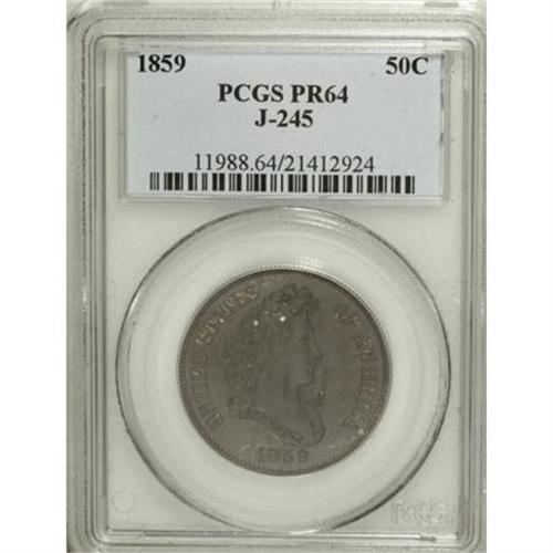 <B>1859 P50C Half Dollar, Judd-245, Pollock-301, 303, Low R.6, PR64 PCGS.</B></I> The obverse features a bust of Liberty facing right with a wreath of oak and vine leaves adorning her head. The word LIBERTY is inscribed on a ribbon that overlays Liberty's shoulder. The legend UNITED STATES OF AMERICA is around the periphery, the date 1859 is below. The reverse displays a spread eagle design with a broken ribbon. Struck in silver with a reeded edge from a notably lapped reverse die. The centers are not fully struck, but otherwise an attractive piece with deep steel-gray and blue colors. Assumedly, Pollock-301, which has a perfect ribbon and a rust-free reverse die, is the 'original' variety of Judd-245, while Pollock-303, which is struck from a lapped and rusted reverse die, is a mint-made restrike. <BR><BR><b>Shipping:</b> Coins & Currency (<a target="_blank" href="http://www.heritageauctions.com/common/shipping.php">view shipping information</a>)