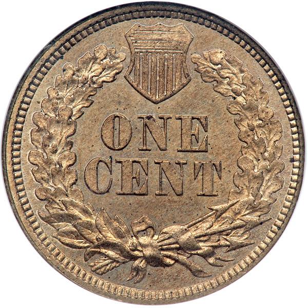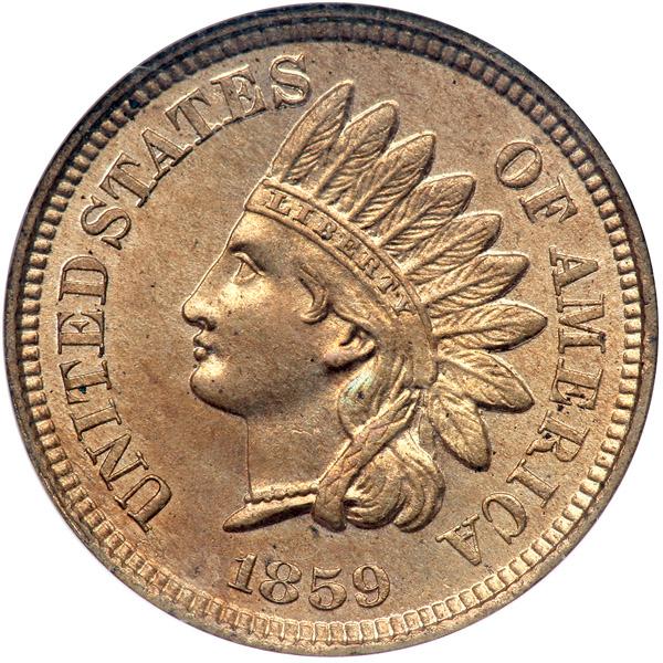 1859 Pattern Cent. Copper-nickel, plain edge. Judd-228. Pollock-272 Rarity 1. NGC graded MS-65. The familiar (and ever-popular) Transitional Pattern which incorporates the obverse of 1859 (first year issue) with the Oak Wreath & Shield reverse introduced the next year. A fair number were minted and so this one can be collected easily without breaking the bank. Alluring Gem. Pop 37; 7 finer in 66 (PCGS # 11932) .