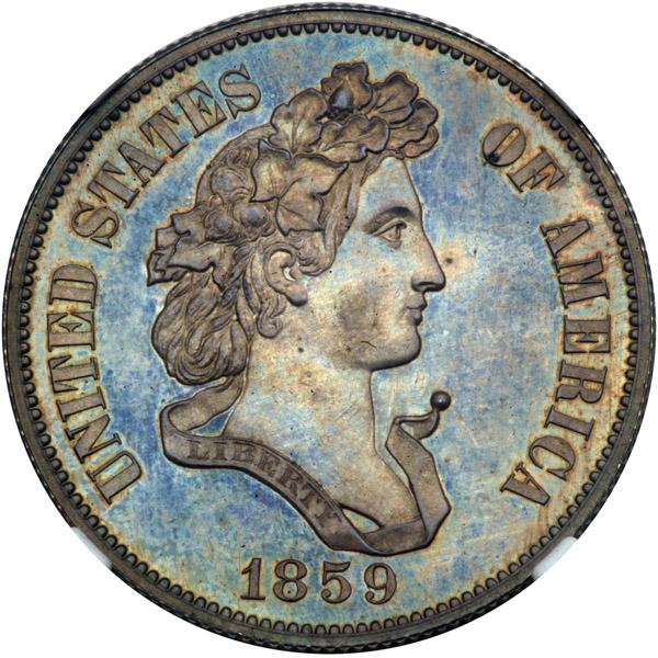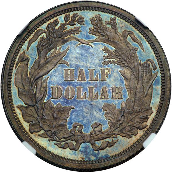 1859 Pattern Half Dollar. Silver, reeded edge. Judd-237. Pollock-293. Rarity 4. NGC graded Proof 64 CAC Approved. Lovely blue toning on both sides adds to this coin's appeal. The Longacre design. Pop 6; 8 finer (PCGS # 11966) .