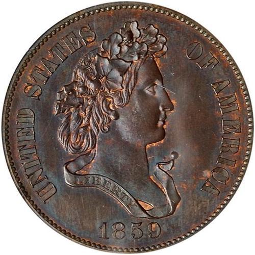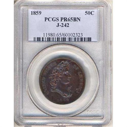 <b>1859 Pattern Half Dollar. Copper, reeded edge. Judd-242. Pollock-298. PCGS graded PF65 BR.</b> Glossy brown color with lovely purple and blue undertoned. A bold gem of this fascinating design by Longacre. A scarce Pattern <b>(PCGS # 11981)</b>