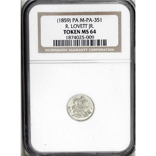 <B>(1859) R. Lovett Jr. M-Pa-351, Philadelphia, PA, MS64 NGC.</B></I> German silver. Luminous and pleasing despite infrequent carbon flecks. The obverse imitates the St. George reverse of a British gold sovereign. Prolific engraver Robert Lovett Jr. is also credited as designer of the famous Confederate cent.<BR><I>From The Troy Wiseman Collection.</B></I>