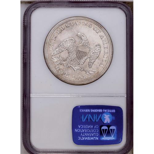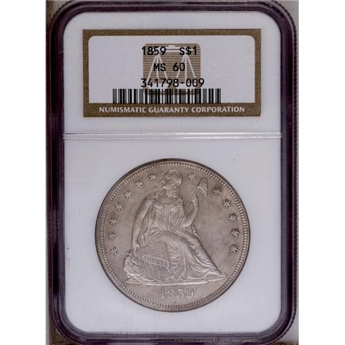 <B>1859<img border='0' src='http://www.heritagecoins.com/images/star.gif' width=10 height=10>$1> MS60 NGC.</B></I> Well struck with a satiny obverse and a glassy, semi-prooflike reverse, this dove-gray example shows a few wispy marks and hairlines in the fields that restrict the grade. A planchet flaw (as struck) is noted in the upper obverse field between Liberty's left (facing) elbow and star 4. A scarce issue that has a low survival rate out of a mintage of 255,700 pieces. Census: 2 in 60, 30 finer (3/06).