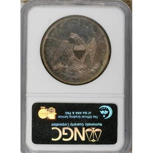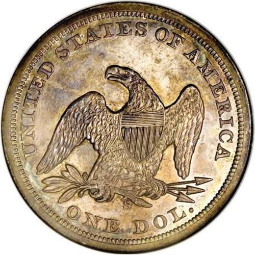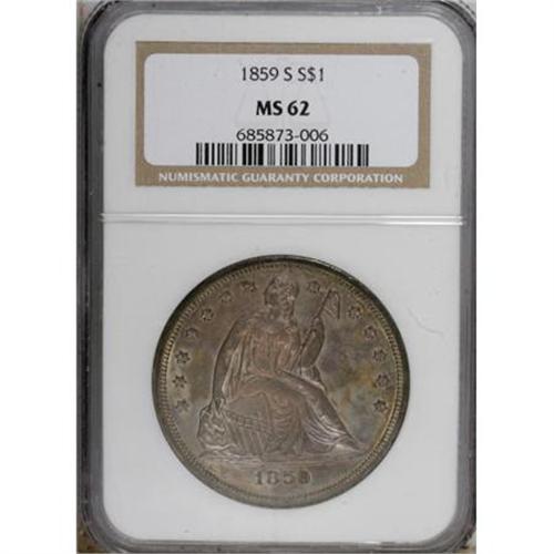 <B>1859-S $1 MS62 NGC.</B></I> Breen-5462. This coin comes from an early die state of the Breen-5462 die set, with repunching evident on the 18 in the date. While the San Francisco Mint struck its first gold dollar in 1854, the year it opened, its first silver dollar issue would not come until 1859, five years later. The 1859-S dollars, 20,000 pieces in all, mostly made their way overseas through American-Oriental trade channels, and most examples either found the melting pot or encountered heavy wear. The unworn representative offered here is an uncommonly well-preserved survivor. The strike is sharp throughout, unlike many examples that show weakness on the devices, and a veil of vibrant orange, magenta, blue, and violet patina drapes the luminous surfaces. A number of light, wispy abrasions in the fields and on the devices account for the grade, though their impact on the coin's visual appeal is minor.<BR><BR><B>Coin Engraver:</B> Christian Gobrecht<BR><BR><b>Shipping:</b> Coins & Currency (<a target="_blank" href="http://www.heritageauctions.com/common/shipping.php">view shipping information</a>\)