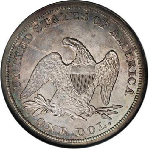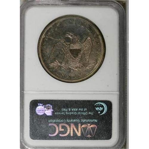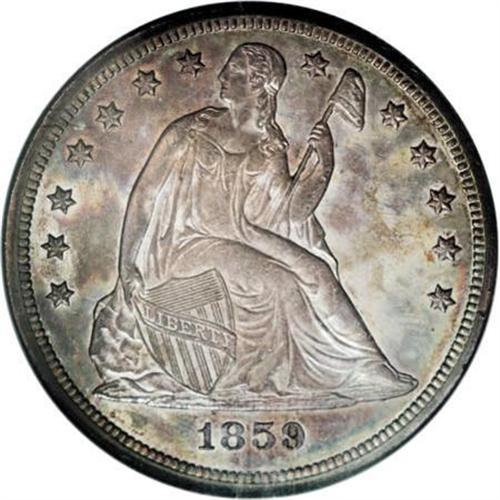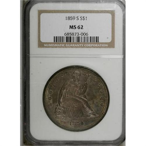 <B>1859-S $1 MS62 NGC.</B></I> Breen-5462. This coin comes from an early die state of the Breen-5462 die set, with repunching evident on the 18 in the date. While the San Francisco Mint struck its first gold dollar in 1854, the year it opened, its first silver dollar issue would not come until 1859, five years later. The 1859-S dollars, 20,000 pieces in all, mostly made their way overseas through American-Oriental trade channels, and most examples either found the melting pot or encountered heavy wear. The unworn representative offered here is an uncommonly well preserved survivor. The strike is sharp throughout, unlike many examples that show weakness on the devices, and a veil of vibrant orange, magenta, blue, and violet patina drapes the luminous surfaces. A number of light, wispy abrasions in the fields and on the devices account for the grade, though their impact on the coin's visual appeal is minor. NGC Census: 6 in 62, 5 finer (9/07).<BR><BR><B>Coin Engraver:</B> Christian Gobrecht<BR><BR><b>Shipping:</b> Coins & Currency (<a target="_blank" href="http://www.heritageauctions.com/common/shipping.php">view shipping information</a>)
