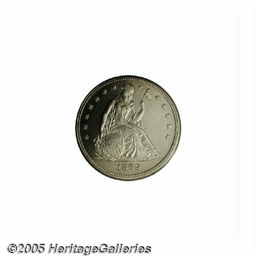 <B>1859<S$1> MS62 PCGS.</B></I> At first glance, this lovely example looks like a proof with its fully mirrored fields. Careful examination reveals its true status, that of a prooflike business strike. The depth of the mirrored surface and the strength of the strike are two factors to consider when making this determination. While fully prooflike, the fields are not deeply mirrored as on a true proof, and the strike is weak, especially at the top and right side of the obverse. The surfaces are fully brilliant white with minor hairlines visible in the fields. Overall, this is an attractive example, and seldom seen with a prooflike finish.