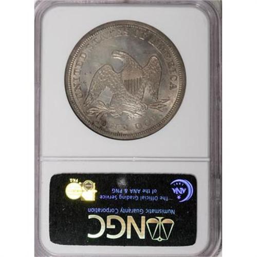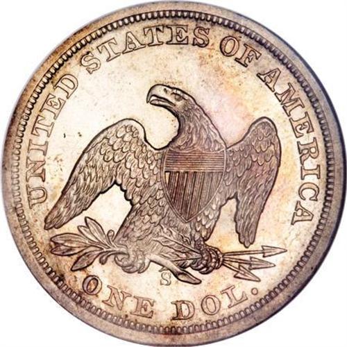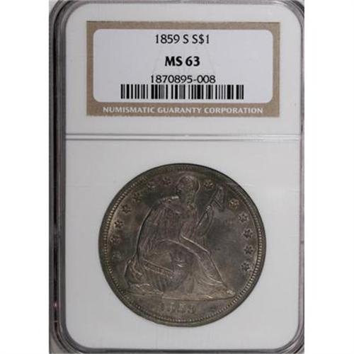 <B>1859-S $1 MS63 NGC.</B></I> In terms of availability in Mint State grades, the 1859-S silver dollar is a standout issue with only 35 coins graded as MS60 or better by NGC and PCGS combined. 1859-S dollars grading Select Uncirculated, such as the current example, are truly rare. Including possible resubmissions of the same coin, a scant 11 examples have received the MS63 designation at both services collectively, with only one grading finer. The rarity of the 1859-S in high grade is due to the fact that the entire mintage of S-mint silver dollars that year were exported to the Orient. Most examples that made the return voyage home show signs of handling and wear. This piece is sharply struck and there are no obvious abrasions that interrupt the flow of the silky mint frost that covers each side. Variegated gray-lilac and golden-rose color is seen on each side of this important, high grade Seated dollar. Census: 4 in 63, 1 finer (3/08).<BR><I>From The Queller Family Collection of Silver Dollars.</B></I><BR><BR><B>Coin Engraver:</B> Christian Gobrecht<BR><BR><b>Shipping:</b> Coins & Currency (<a target="_blank" href="http://www.heritageauctions.com/common/shipping.php">view shipping information</a>)