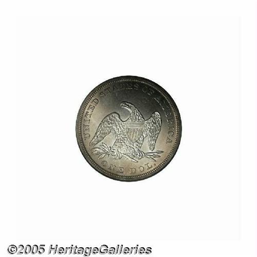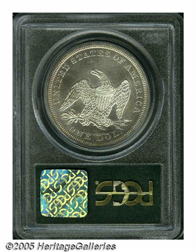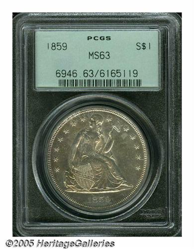 <B>1859<S$1> MS63 PCGS.</B></I> Despite a reasonable mintage of 256,500 pieces, the 1859 is scarce in all grades, and is much more difficult to locate in Mint State than its New Orleans counterpart. This satiny older holder example is attractively toned in honey color, and is well struck save for the softness on Liberty's hair and nearby star so often encountered on business strikes of the design. A few minor marks on the fields and Liberty's neck do not substantially alter the eye appeal. Population: 14 in 63, 6 finer (6/05).<BR><I>From The Dr. John L. Pellegrini Collection of Liberty Seated Dollars.</B></I>