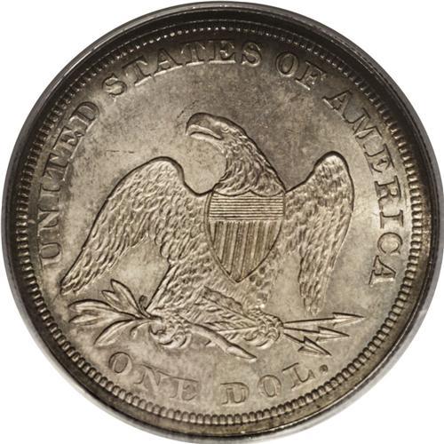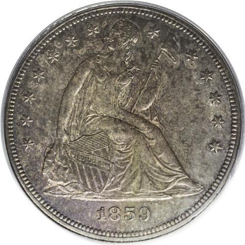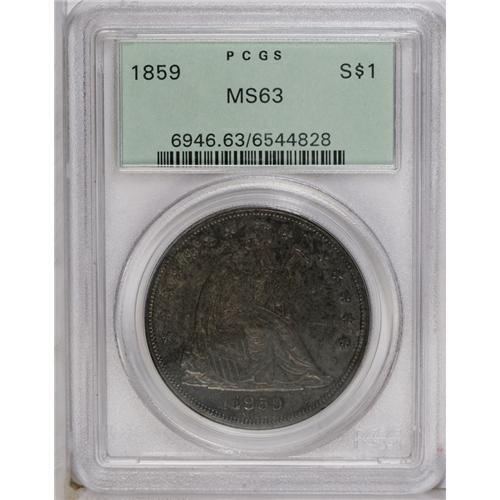 <B>1859<img border='0' src='http://www.heritagecoins.com/images/star.gif' width=10 height=10>$1> MS63 PCGS.</B></I> The Bowers <I>Silver Dollars and Trade Dollars of the United States, A Complete Encyclopedia</B></I> states of this date: "Very few Uncirculated specimens exist. Dealers' memories are not always precise on this, for the availability in quantity of Mint State 1859-O sometimes causes confusion, but mintmarkless coins are rarities. In 1992, dealer specialist Chris Napolitano told me that he had never had a Mint State 1859 in stock, in the course of handling several collections and many rarities."<BR> This unquestioned Mint State example offers deep brownish-gold patina on the obverse, with much-lighter amber-gold and silver accents on the reverse. A few light ticks and abrasions on each side account for the grade. Certified in a green-label holder. Population: 13 in 63, 7 finer (8/06).