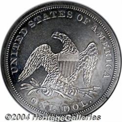 <table><tr><td><table><tr><td>1859 S$1 PR64 NGC. An earlier proof delivery in this series, the 1859 was probably not well received by the collecting public of the late 1850s, and we doubt whether all 800 pieces produced actually left the Mint. This fortunate specimen was produced with a partial cameo finish; the fields are nicely mirrored, the devices frosty. The surfaces are veiled in moderate charcoal-gray iridescence that is accented with blue and antique-gold colors. A fully brought up example, a couple of surface abrasions are noted above ONE DOL in the field. Grade limiting hairlines are more prolific on the obverse. <BR><BR><B>Important notice:</B> Heritage usually auctions material at the rate of 200-250 lots per hour. On some occasions eBay Live bid software or the Internet may not be able to keep up with the pace of the auction. We recommend placing a realistic absentee bid now as insurance to avoid disappointment. Occasionally the auctioneer may eliminate or reject an eBay Live bid, and the auctioneer may also reopen a lot after the close of the eBay live bidding (usually because we missed an audience bid), and may reject your bid even if it shows you as the winning bidder. By bidding via eBay Live, you agree that Heritage may award the lot to another bidder at its sole discretion under the circumstances described above or any other reasonable circumstances. Since eBay bids are not shown to us until we open the lot on the floor, we treat those bids just like floor bids. In most cases the floor responds before the eBay bid is presented to us, due to Internet lag time, so for consistency we have made it a policy that floor bids are always considered first over tie eBay live bids. Also please note that all Heritage lots purchased through eBay Live carry a 20% Buyer's Premium. Please make sure you read the Terms and Conditions before you bid. <BR><BR><B>IMPORTANT ANNOUNCEMENT ABOUT RESERVES:</B> Heritage now divulges all reserves on its web site 7 days before every auction. If you want to know whether the reserve on this lot has been met, and if not, what the reserve amount is, please visit this lot page on the HeritageCoin.com web site, or email: bid@HeritageGalleries.com </span></font></td></tr></table></td></tr></table>