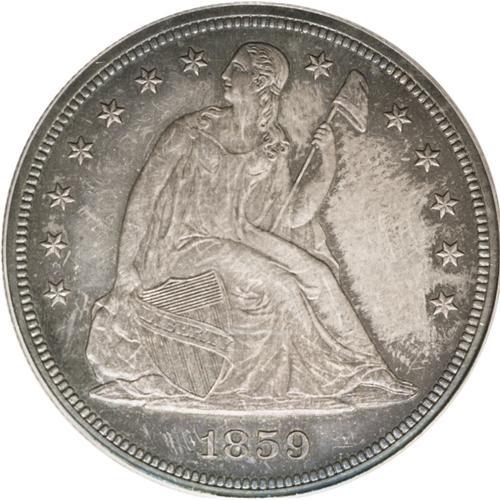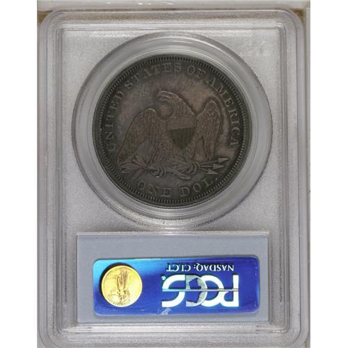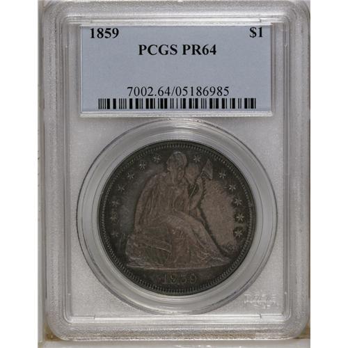 <B>1859 S$1 PR64 PCGS.</B></I> Deep indigo and violet patination marks the smooth surfaces of this near-Gem. The heavy toning precludes any chance of contrast between devices and fields, but considerable reflectivity remains, most notably in the outer expanses of the fields. The strike is sharp, as would be expected of a proof issue. The 1 is repunched, diagnostic of proofs of this date.<BR><BR><b>Shipping:</b> Coin/Currency (<a target="_blank" href="http://www.heritageauctions.com/common/shipping.php">view shipping information</a>)