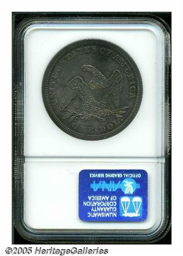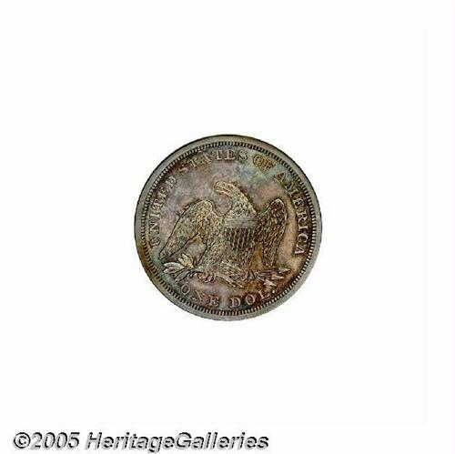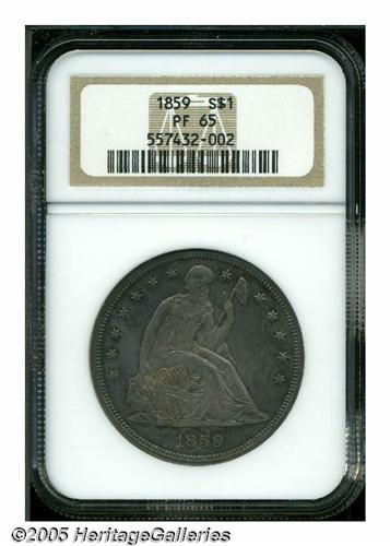 <B>1859<S$1> PR65 NGC.</B></I> This proof Silver Dollar issue is among our favorites. So little is known about the die combination of this date, and the scarcity of survivors presents quite a challenge to even the most dedicated researcher. Based on our findings, there seems to be only one obverse die for this issue, and it is easily identifiable by repunching on the base of the 1 in the date. The reverse die that the Mint used to strike this particularly coin displays remnants of an inner circle at the denticles above the UNI in UNITED. An originally preserved Gem, both sides are awash in lavender-charcoal hues with blushes of cobalt-blue tinting toward and around many of the peripheral devices. There are no areas of bothersome striking incompleteness, and distracting handling marks are also conspicuous by their absence. Pedigree concerns compel us to mention a well concealed planchet flaw (as struck) in the left reverse field that has toned a little darker than the other surface areas. Although Mint records record an original mintage of 800 pieces for the proof 1859 Seated Dollar, fewer than 450 examples are believed to have been sold. The balance of the production run was melted at year's end.