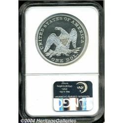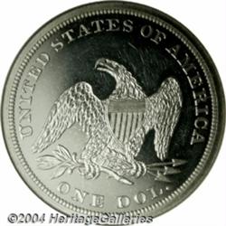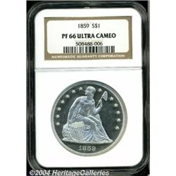 <B>1859<S$1> PR66 Deep Cameo NGC.</B></I> Beginning in 1859, the mint made definite efforts to market proof coins to the then-fledgling coin collecting community, and proof issues from this date on, while still rare, are more available than those of prior years. Stone-white devices have unimprovable contrast with the deeply mirrored fields. The upper reverse field displays a few wispy striations of mint origin. The base of the 1 in the date is recut. The <I>Guide Book</B></I> reports a production of just 800 proofs, and only a handful of survivors can approach the lofty preservation of this spectacular white on black premium Gem. The present piece is the only one certified as Ultra Cameo by NGC, and PCGS has not encapsulated any examples as Deep Cameo. <BR><BR><B>Important notice:</B> Heritage usually auctions material at the rate of 200-250 lots per hour. On some occasions eBay Live bid software or the Internet may not be able to keep up with the pace of the auction. We recommend placing a realistic absentee bid now as insurance to avoid disappointment. Occasionally the auctioneer may eliminate or reject an eBay Live bid, and the auctioneer may also reopen a lot after the close of the eBay live bidding (usually because we missed an audience bid), and may reject your bid even if it shows you as the winning bidder. By bidding via eBay Live, you agree that Heritage may award the lot to another bidder at its sole discretion under the circumstances described above or any other reasonable circumstances. Since eBay bids are not shown to us until we open the lot on the floor, we treat those bids just like floor bids. In most cases the floor responds before the eBay bid is presented to us, due to Internet lag time, so for consistency we have made it a policy that floor bids are always considered first over tie eBay live bids. Also please note that all Heritage lots purchased through eBay Live carry a 20% Buyer's Premium. Please make sure you read the Terms and Conditions before you bid. </span></font></tr></table></td></tr></table>