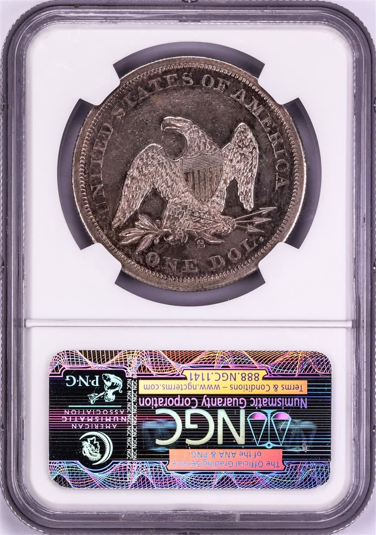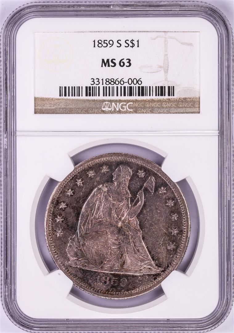 One 1859-S $1 Seated Liberty Silver Dollar Coin NGC MS63. NGC Certified.
