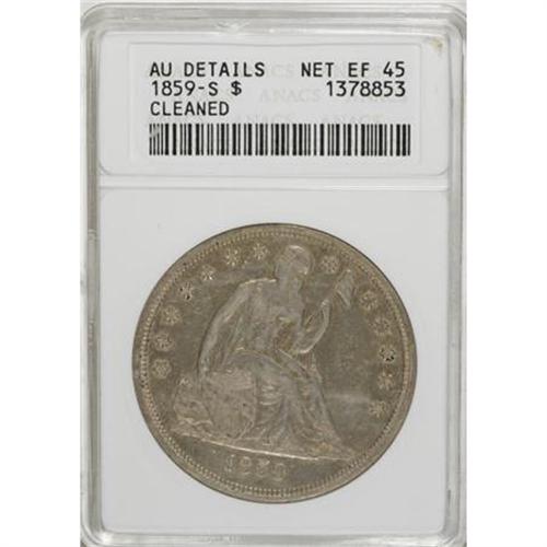 <B>1859-S $1 --Cleaned--ANACS. AU Details, Net XF45.</B></I> David Bowers (2006) writes of the 1859-S dollar that: "Most of the mintage was exported to China, where they were melted." Magnification reveals fine hairlines on the golden-gray surfaces, where traces of luster still reside in the recesses. Good definition is apparent on the motifs.<B><BR></B></I><I>From The Beau Clerc Collection.</B></I><BR><BR><B>Coin Engraver:</B> Christian Gobrecht<BR><BR><b>Shipping:</b> Coins & Currency (<a target="_blank" href="http://www.heritageauctions.com/common/shipping.php">view shipping information</a>)