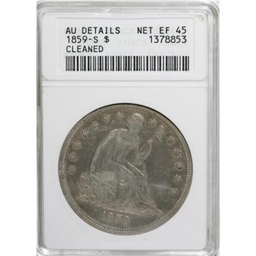 <B>1859-S $1 --Cleaned--ANACS. AU Details, Net XF45.</B></I> David Bowers (2006) writes of the 1859-S dollar that: "Most of the mintage was exported to China, where they were melted." Magnification reveals fine hairlines on the golden-gray surfaces, where traces of luster still reside in the recesses. Good definition is apparent on the motifs.<BR><BR><B>Coin Engraver:</B> Christian Gobrecht<BR><BR><b>Shipping:</b> Coins & Currency (<a target="_blank" href="http://www.heritageauctions.com/common/shipping.php">view shipping information</a>)