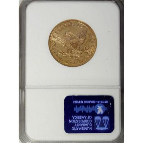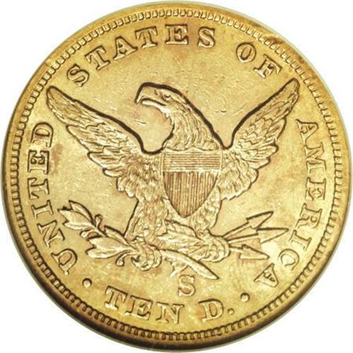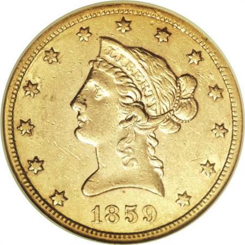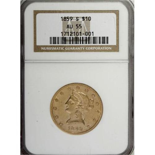<B>1859-S $10 AU55 NGC.</B></I> The early San Francisco Mint issues struck from 1854 through 1866 are all characterized by low mintages and low survival rates. During this 13-year period the entire output of San Francisco Mint eagles amounted to just 316,000 coins, or just 24,000 per year. More than one-third of this total production occurred in 1854, so the revised average for 1855 to 1866 was a mere 16,000 coins per year. Of course, in 1859 the production of eagles was limited to just 7,000 coins. <BR> This piece is a Choice AU example of that mintage with rich green-gold surfaces and nearly full satin luster. Splashes of pale orange toning are evident on each side, and the fields are faintly reflective. Census: 4 in 55, 1 finer (12/07).<BR><BR><B>Coin Engraver:</B> Christian Gobrecht<BR><BR><b>Shipping:</b> Coins & Currency (<a target="_blank" href="http://www.heritageauctions.com/common/shipping.php">view shipping information</a>)