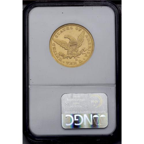 <B>1859-S<$10> Fine 15 NGC.</B></I> Liberty's hair and the eagle's plumage exhibit substantial wear, yet the shield and lower half of the eagle's body retains pleasing detail. Not as well known as the 1859-O, but nearly as rare, since the production of 7,000 pieces had a high rate of attrition. A minor reverse rim ding is noted at 7:30. Census: 2 in 15, 46 finer (3/06).<BR><I>From The Steve Glenn Collection.</B></I> <BR><BR><B>Important notice:</B> Heritage usually auctions material at the rate of 200-250 lots per hour. On some occasions eBay Live bid software or the Internet may not be able to keep up with the pace of the auction. We recommend placing a realistic absentee bid now as insurance to avoid disappointment. Occasionally the auctioneer may eliminate or reject an eBay Live bid, and the auctioneer may also reopen a lot after the close of the eBay live bidding (usually because we missed an audience bid), and may reject your bid even if it shows you as the winning bidder. By bidding via eBay Live, you agree that Heritage may award the lot to another bidder at its sole discretion under the circumstances described above or any other reasonable circumstances. Since eBay bids are not shown to us until we open the lot on the floor, we treat those bids just like floor bids. In most cases the floor responds before the eBay bid is presented to us, due to Internet lag time, so for consistency we have made it a policy that floor bids are always considered first over tie eBay live bids. Also please note that all Heritage lots purchased through eBay Live carry a 20% Buyer's Premium. Please make sure you read the Terms and Conditions before you bid. This lot is being auctioned in conjunction with a live floor auction by Heritage Galleries & Auctioneers. All final auction and invoice information will be supplied by Heritage Galleries & Auctioneers, and all other information should be considered preliminary. Lot:3952 <BR><BR><B>Winning Notification and Billing:</B> After the FINAL session in this auction is complete, Heritage will send e-mail and snail mail invoices. This process normally takes several days. All final auction and invoice information will be supplied by Heritage Galleries & Auctioneers, and all other information should be considered preliminary. <BR><BR>This auction will be conducted on a live auction floor and over the Internet through eBay Live. If you choose to place an absentee bid, please take a moment to <font color='#0000ff'><u><a href='http://pages.ebay.com/liveauctions/help/before/laabsentee.html'>learn how eBay Live absentee bidding works</a></u></font><font color='#000000'>