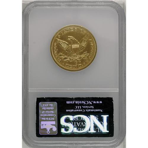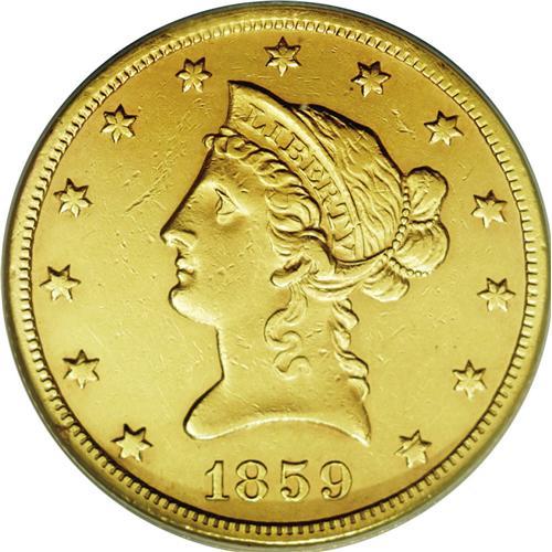 <B>1859-S<$10>--Improperly Cleaned--NCS. AU Details.</B></I> The low-mintage (7,000 pieces) 1859-S is best known for its condition rarity, but is a most difficult issue in terms of absolute rarity as well. The specimen offered here is well struck in the centers, although the normal softness is noticed on the stars, and only a few, very minor abrasions can be found. The signs of cleaning are the fly in the ointment as the surface are quite dull as a result. Still, a desirable example.