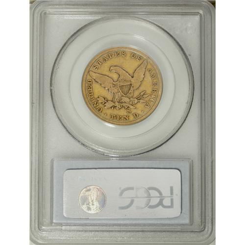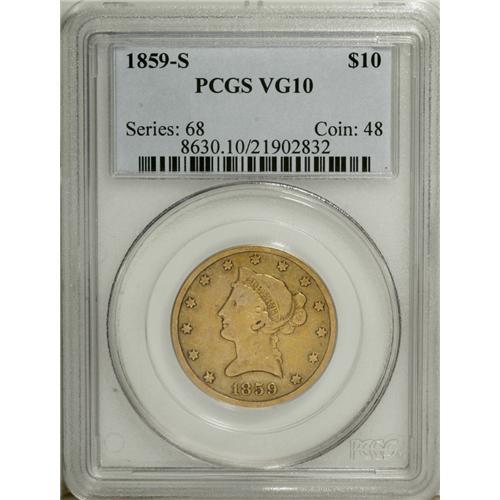 <B>1859-S $10 VG10 PCGS.</B></I> A significantly worn example that testifies to the heavy use federal gold coins found in California. Orange-gold with lavender accents. Population: 1 in 10, 26 finer (11/06).<BR><BR><b>Shipping:</b> Coin/Currency (<a target="_blank" href="http://www.heritageauctions.com/common/shipping.php">view shipping information</a>)