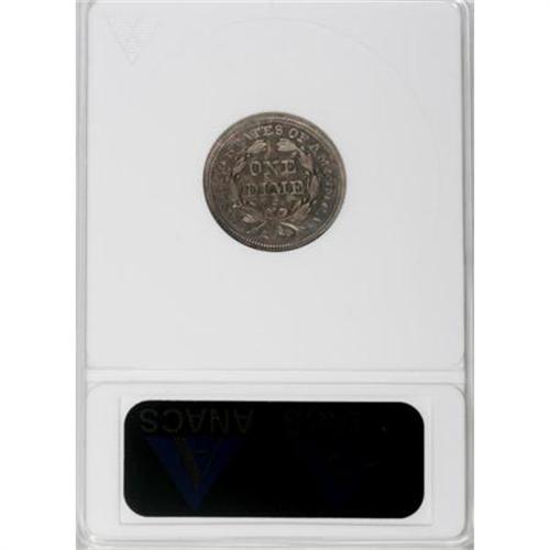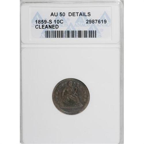 <B>1859-S 10C --Cleaned--ANACS. AU50 Details.</B></I> The deep sea-green and tan-gray surfaces are minutely granular. A splendidly detailed dime with minor incompleteness of strike on Liberty's hair and the wreath bow. A mere 60,000 pieces were struck, and since there were no serious West Coast collectors until decades later, only a few Mint State examples are known.<BR><BR><b>Shipping:</b> Coins & Currency (<a target="_blank" href="http://www.heritageauctions.com/common/shipping.php">view shipping information</a>)