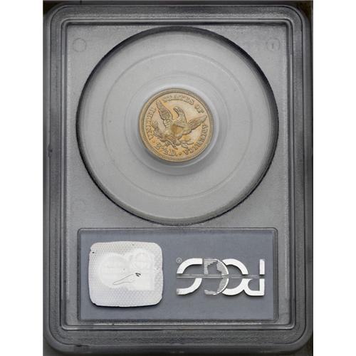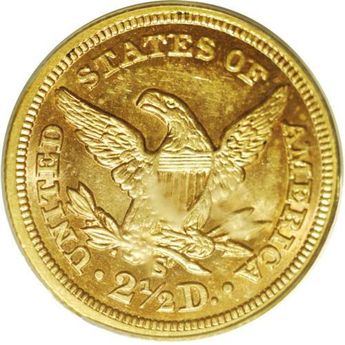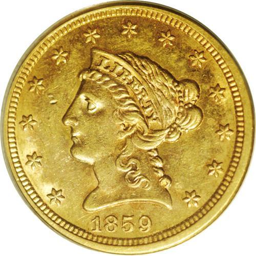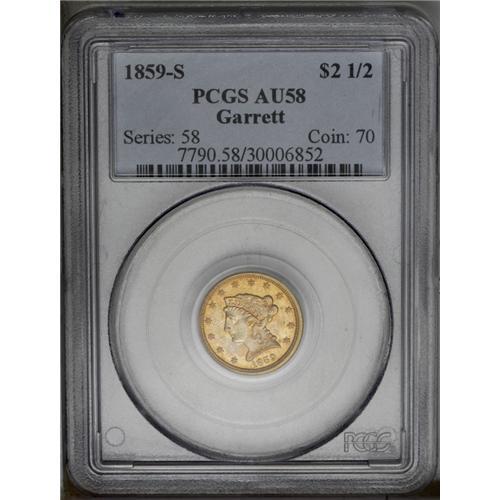 <B>1859-S $2 1/2 AU58 PCGS.</B></I> Ex: Garrett. Orange-gold color dominates, although the cheek and open fields offer lighter steel-gray toning. A suitably struck and problem-free example that has a formidable pedigree. Only 15,200 pieces were struck, all with the Old Reverse subtype. Population: 6 in 58, 4 finer (1/06).<BR><I>Ex: Wilharm Collection; Garrett Collection; Bowers & Ruddy, 3/80, lot 764.</B></I>