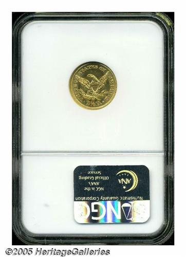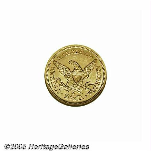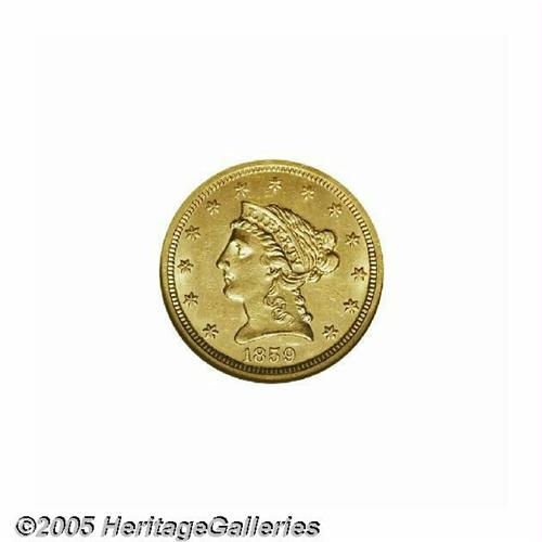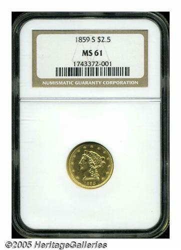 <B>1859-S<$2 1/2> MS61 NGC.</B></I> Fewer than 125 1859-S Quarter Eagles are extant today from an original mintage of 15,200 pieces, and few of these coins grade above the AU level. In fact, NGC and PCGS combined report only 14 examples in all Mint State grades. A bright and relatively clean example, the surfaces are confined to the MS61 level due to a number of small scattered marks overall. The sharply struck, copper-gold surfaces are, nonetheless, very attractive for the issue. Population: 4 in 61, 6 finer (5/05).