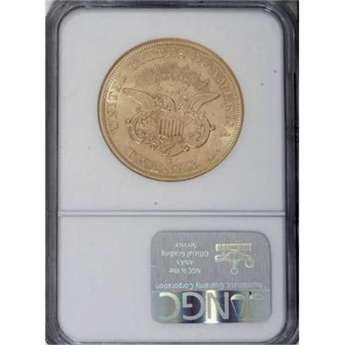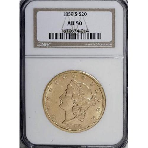 <B>1859-S $20 AU50 NGC.</B></I> Bright peach-gold surfaces display traces of luster in the protected areas of this AU50 specimen. Generally well defined, with no more than the expected number of marks usually found on these large, heavy coins.<BR><BR><b>Shipping:</b> Coins & Currency (<a target="_blank" href="http://www.heritageauctions.com/common/shipping.php">view shipping information</a>)
