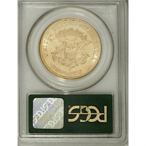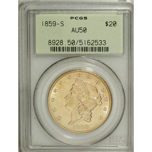<B>1859-S $20 AU50 PCGS.</B></I> Luster forms a bright band across the peripheries of this attractive double eagle. A cluster of thin marks beneath the hairbun determines the grade. Certified in an old green label holder.<BR><BR><b>Shipping:</b> Coins & Currency (<a target="_blank" href="http://www.heritageauctions.com/common/shipping.php">view shipping information</a>)
