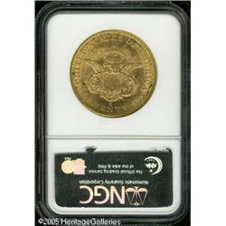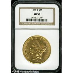 <B>1859-S $20 AU55 NGC.</B></I> Most often seen well worn, this mostly lustrous '59-S displays much of its original mint brilliance under a layer of yellow-gold patination. The surfaces are typically abraded and some black encrustation is seen at portions of the reverse periphery.<BR><I>From The Richard J. Chouinard Collection of United States Coins, Part Two.</B></I> Lot:8985