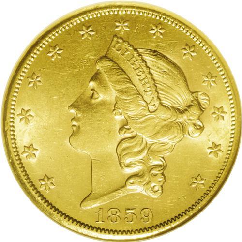 <B>1859-S<$20> AU58 NGC.</B></I> Like many of its peers, this issue is readily available in circulated grades, such as VF and XF, but it is difficult to locate in AU grades. Mint State coins are nearly impossible to find. Even the treasure of the <I>S.S. Republic</B></I> yielded few such coins. The ideal grade for collectors is AU58, providing an excellent marriage of quality and price.<BR> Varieties are known with a repunched date or with the obverse die doubled, visible especially on the coronet and letters of LIBERTY. This example is a normal dies variety with no unusual characteristics. The Wyoming Collection specimen is an excellent example with frosty yellow-gold luster and wonderful eye appeal that is created by pale rose toning within the devices. A trained eye is necessary to detect any wear on the highpoints. Although a few faint hairlines are evident, the surfaces are remarkable for a complete absence of abrasions. The Harry Bass Collection had four examples of this date, but none any finer than this specimen. The Dallas Bank Collection contained one example described as Uncirculated, but the photo suggests that that coin is also no finer than this example.<BR><I>From The Wyoming Collection.</B></I>