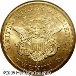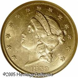 <B>1859-S $20 AU58 NGC.</B></I> The design features are well impressed, and yellow-gold surfaces display luster in the protected areas.<BR><I>From The Richard J. Chouinard Collection of United States Coins, Part Two.</B></I> Lot:8988