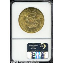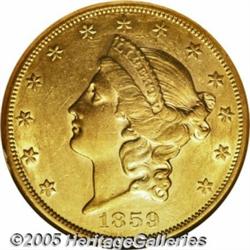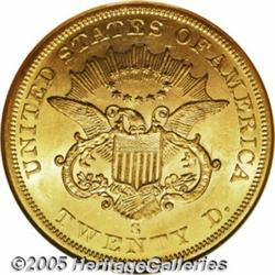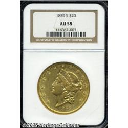 <B>1859-S $20 AU58 NGC.</B></I> This is a lovely example with lustrous light yellow surfaces and exceptional eye appeal, despite some minor impairments in the obverse fields. Faint traces of pale pinkish color are visible in the protected areas of the design. This is not a rare coin, but it is elusive in higher grades. Perhaps only three or four dozen finer examples are known.