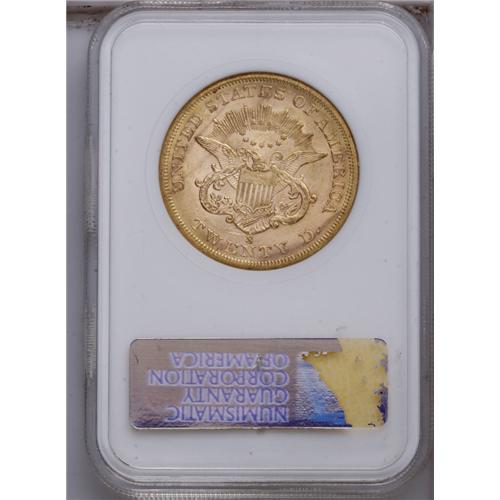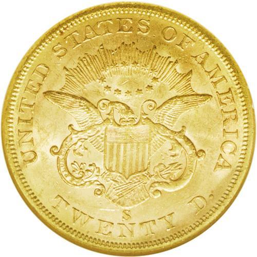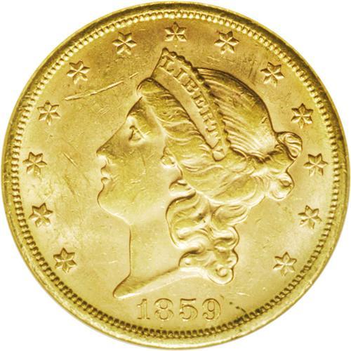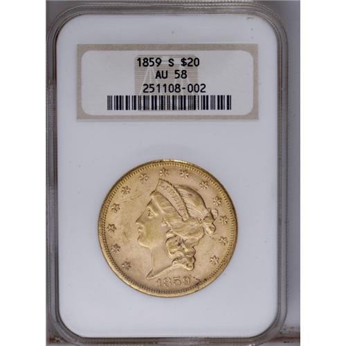 <B>1859-S<$20> AU58 NGC.</B></I> This is an exceptionally frosty coin for the grade whose surfaces are the lightest rub away from Mint State. The left obverse shows a few moderate marks, but the remainder of the piece is clean, and the apricot-gold color is original. A new obverse hub was introduced in 1859, which subtly modified the portrait.