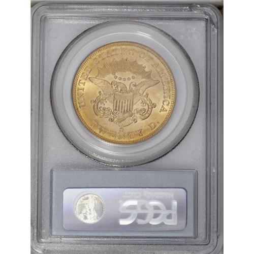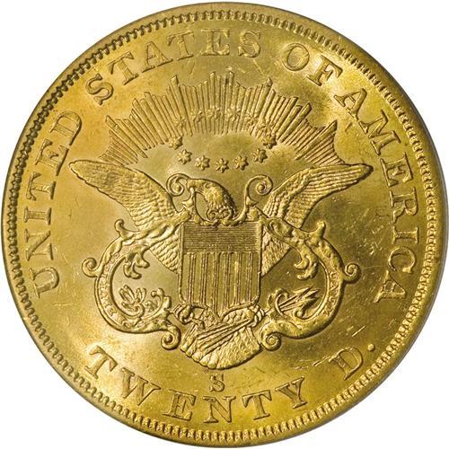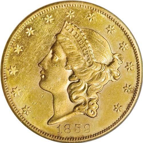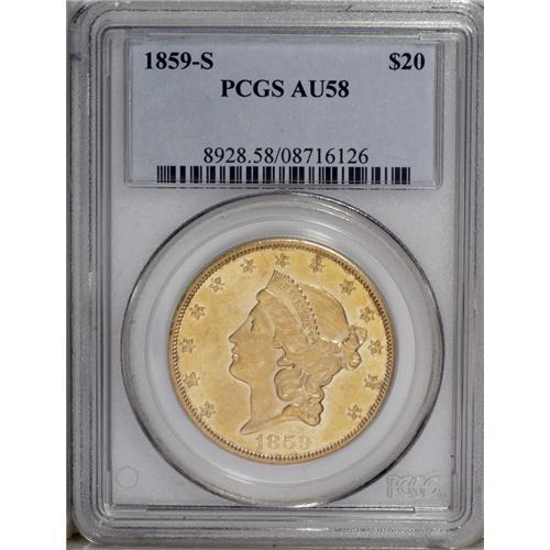 <B>1859-S $20 AU58 PCGS.</B></I> FS-G20-1859S-101. Listed in the new <I>Cherrypickers' Guide.</B></I> LIBERTY and the eye are strongly die doubled. This near-Mint better date Liberty double eagle has a prooflike obverse, and normal cartwheel luster on the reverse. A few moderate obverse marks are no more than expected for a briefly circulated large denomination gold coin. Population: 26 in 58, 33 finer (10/06).<BR><I>From The Oak Island Collection.</B></I><BR><BR><b>Shipping:</b> Coin/Currency (<a target="_blank" href="http://www.heritageauctions.com/common/shipping.php">view shipping information</a>)