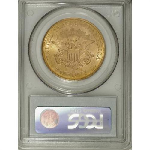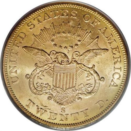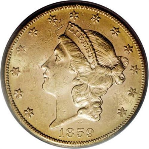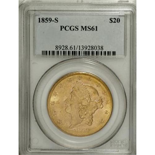 <B>1859-S $20 MS61 PCGS.</B></I> An impressive piece struck at the tail end of the California gold rush, and too late to be on board the <I>S.S. Central America</B></I>. Quite a few were found in the treasure of the S.S. Republic, but they were mostly AU grade coins. This example is fully lustrous with splendid honey-gold color that is framed by olive-gold at the borders. Population: 14 in 61, 16 finer (8/07).<BR><BR><B>Coin Engraver:</B> James B. Longacre<BR><BR><b>Shipping:</b> Coins & Currency (<a target="_blank" href="http://www.heritageauctions.com/common/shipping.php">view shipping information</a>)